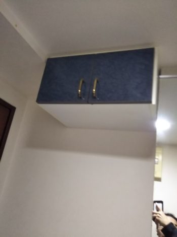 鮮やかな光沢のブルーだった玄関収納にホワイト木目調のシートを貼りました!