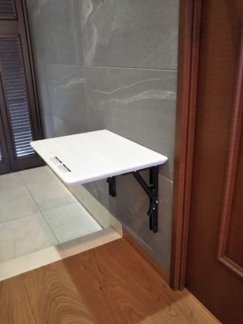 玄関収納正面の壁には、ホワイト木目の折りたたみイスを取付しました。