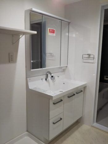 洗面の横にパネルを貼ることで、水が飛んでも拭き取れるようにしました!