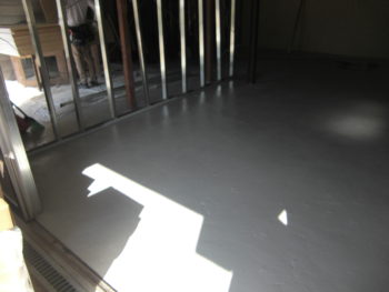 コンクリート土間をしっかりと清掃した後、下地材プライマー塗布の施工写真です。