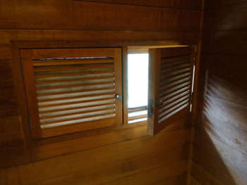 下記の写真は浴室の窓です。サッシ窓の内側に木製ガラリ戸を設けています。プライバシーを確保しながら外部の風を取り込んでいます。↓