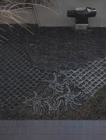 瓦を使用して中庭をデザインする出江さん得意の手