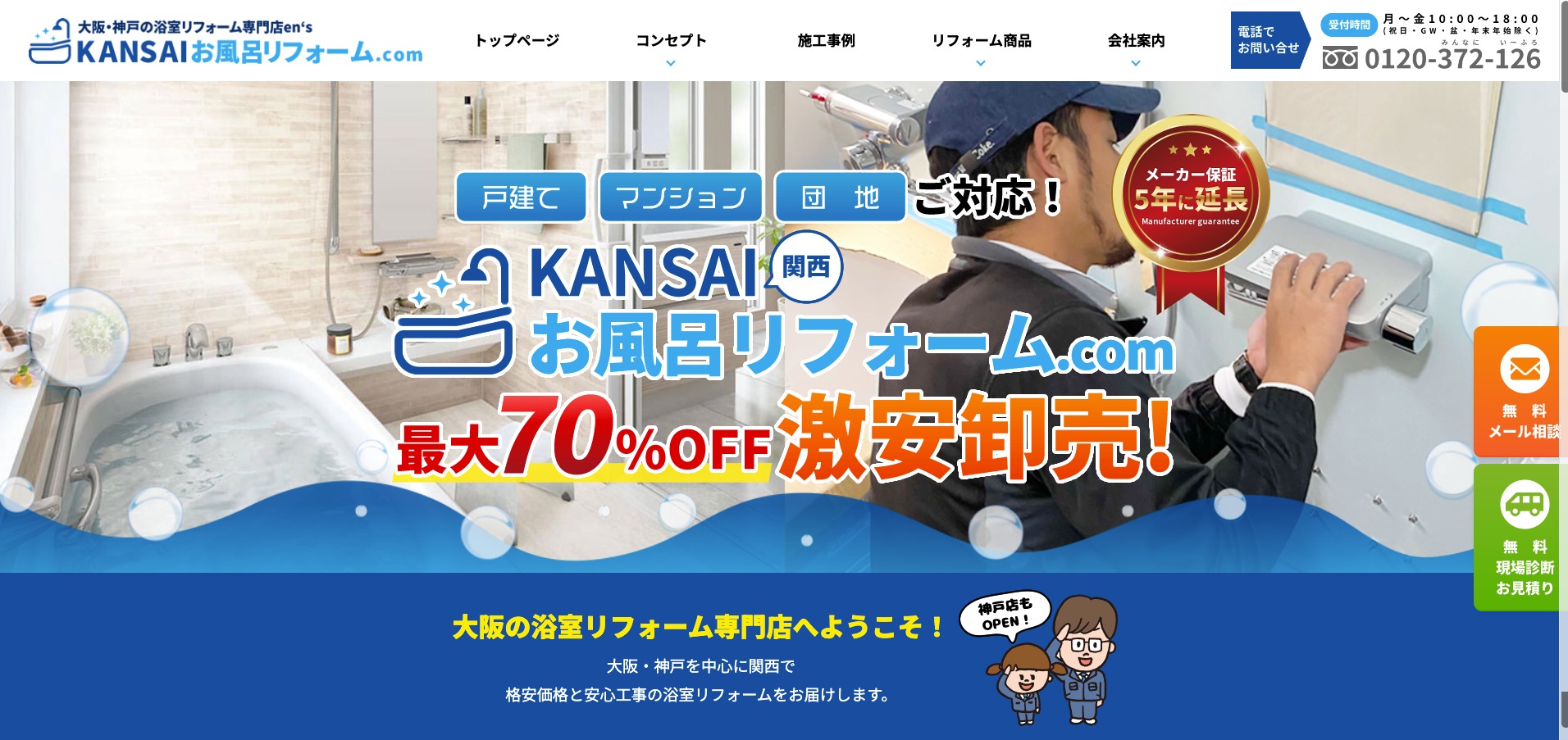 引用元:KANSAIお風呂リフォーム.com公式サイト KANSAIお風呂リフォーム.comは、大阪・神戸を中心に関西で活動している浴室専門リフォーム会社です。日本全国100社の工務店やパワービルダーとの共同仕入れでユニットバスの価格を大幅ダウンしており、最大70%OFFで卸しています。