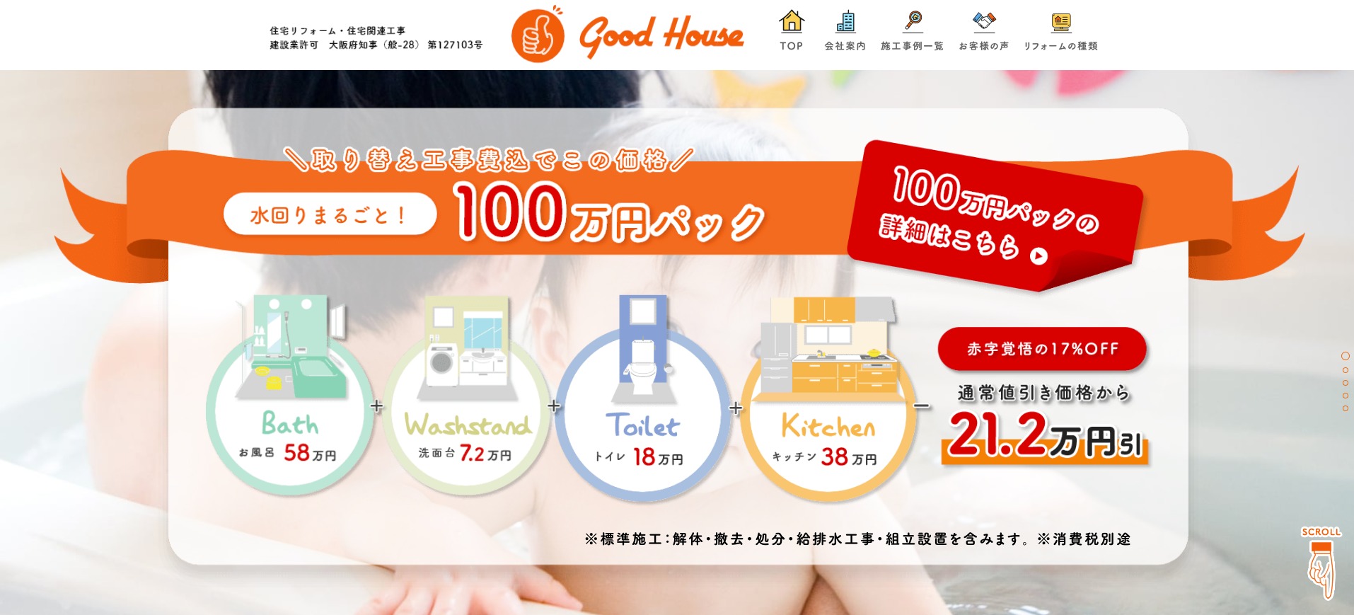 引用元:good house公式サイト good houseは大阪の寝屋川を中心に兵庫・奈良・京都・滋賀・和歌山・三重でリフォームをしているリフォーム業者です。風呂のリフォームだけでなく、キッチンやトイレ、化粧台など多くの水回りリフォームに対応しています。