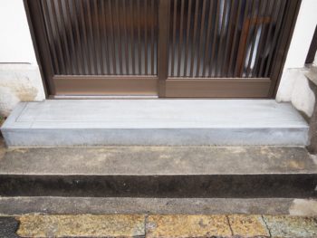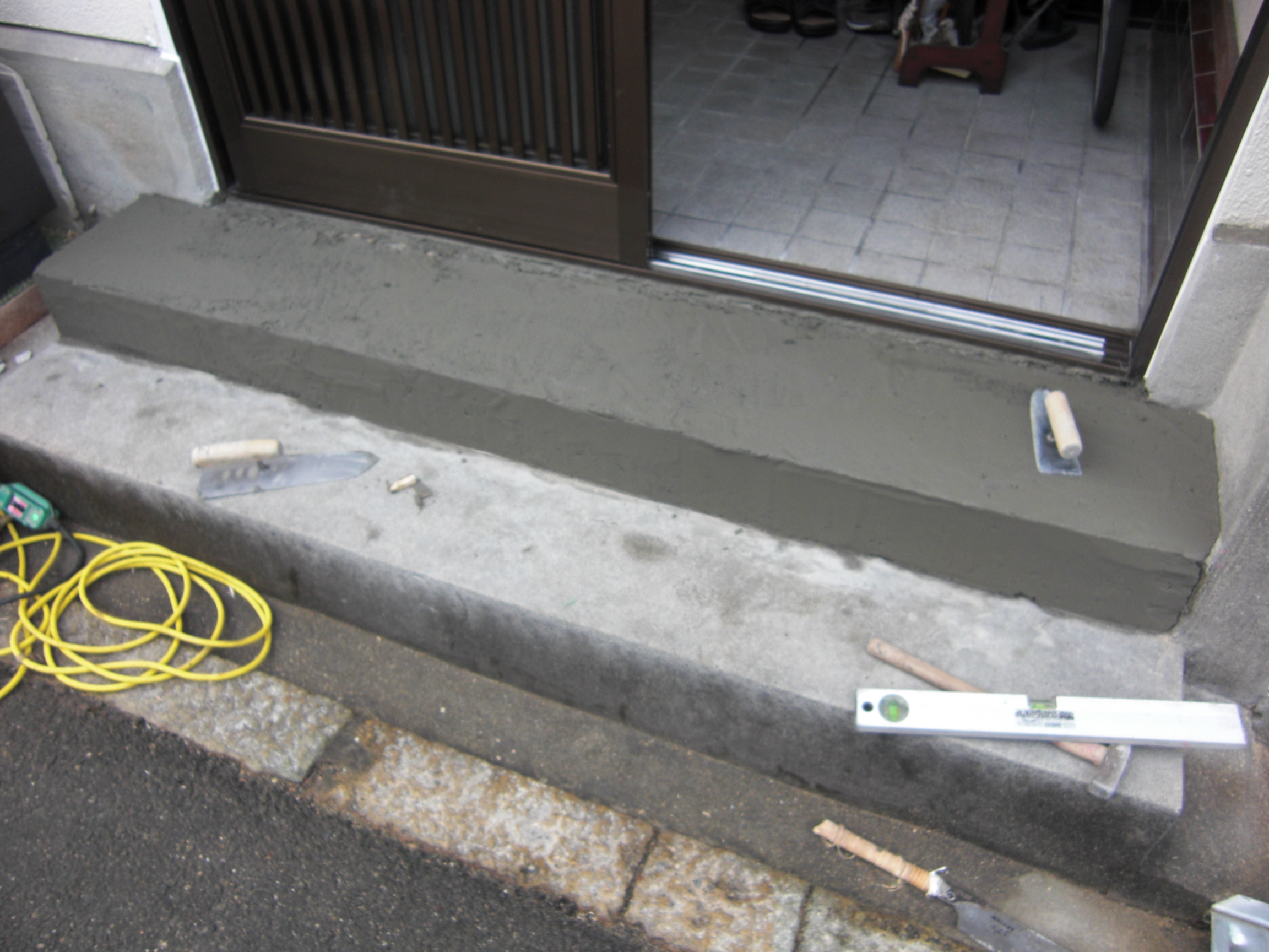 玄関ドア取付後、階段アプローチを左官職人さんに補修してもらっています
