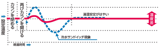 お湯を再出湯するとき、いったん熱いお湯が出て、続いて冷たい水が出たりすることがあります。これは冷水サンドイッチ現象と呼ばれ、シャワー使用時における不快感の原因となっていました。パロマではマイコン制御を活用した「Q機能」を搭載し、再出湯直後のお湯の温度差を最小限に抑え、いつでも快適にお湯をお使いいただける設計となっています。