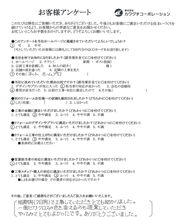 短期間(2日間)で工事していただきとても助かりました。一面だけクロスの色を変えるのも提案していただきやってみてとてもよかったです。