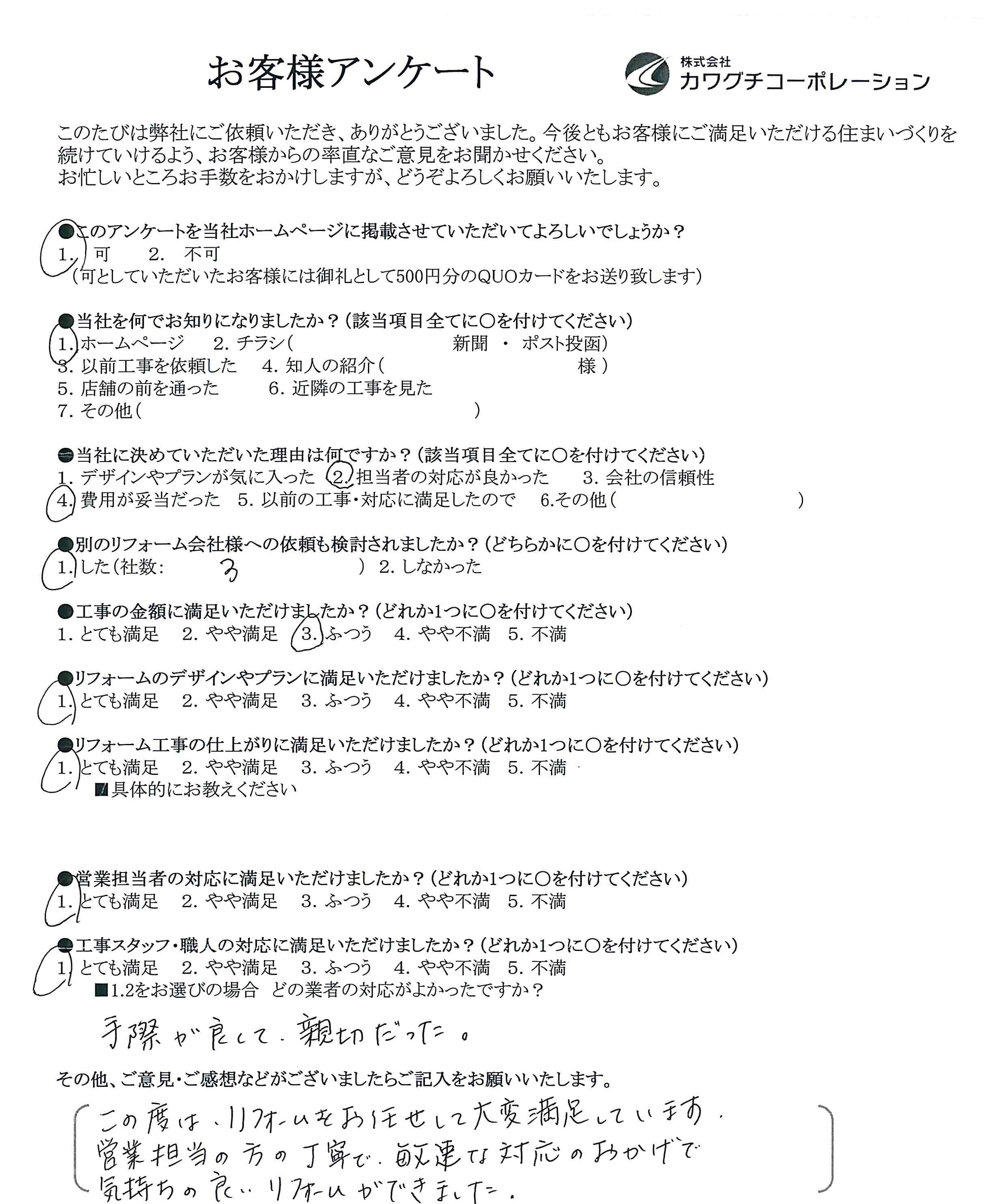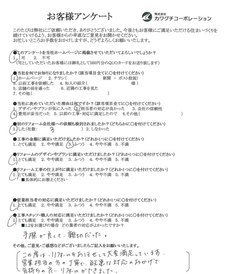 この度はリフォームをお任せして大変満足しています。営業担当の方の丁寧で、敏速な対応のおかげで気持ちの良いリフォームができました。