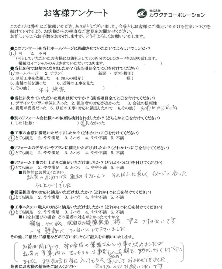 私共の求めていた通りのリフォームと、それ以上に美しくイメージに合った仕上がりでした。