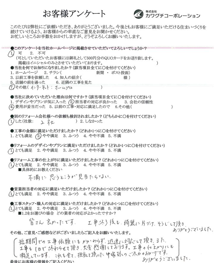 短期間での工事依頼にもかかわらず迅速に対応して頂き、また工事も1日で終わらせて頂き、大変感謝しております。
