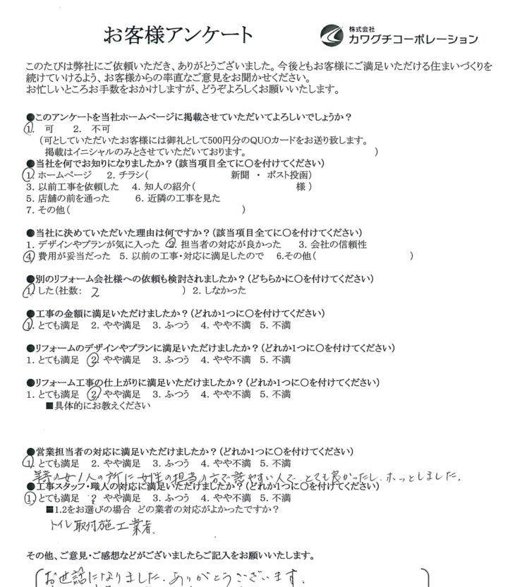 年寄の女1人の所に女性の担当の方で話しやすい方で、とても良かったし、ホッとしました。