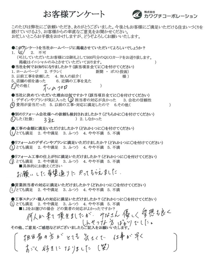 何人か来て頂きましたが、みなさん優しく愛想も良くしんせつな方ばかりでした。