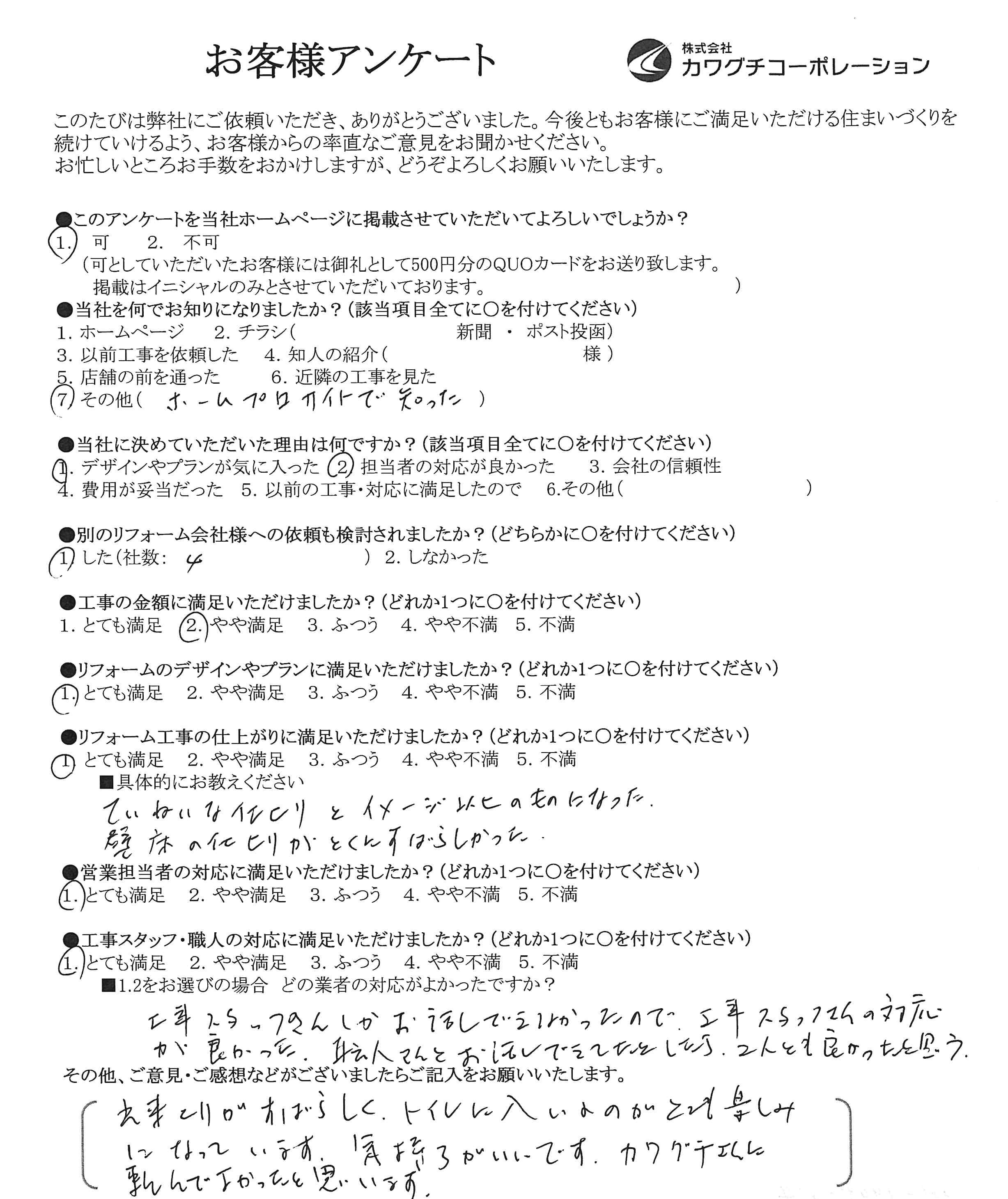 出来上がりがすばらしく、トイレに入るのがとても楽しみになっています。気持ちがいいです。
