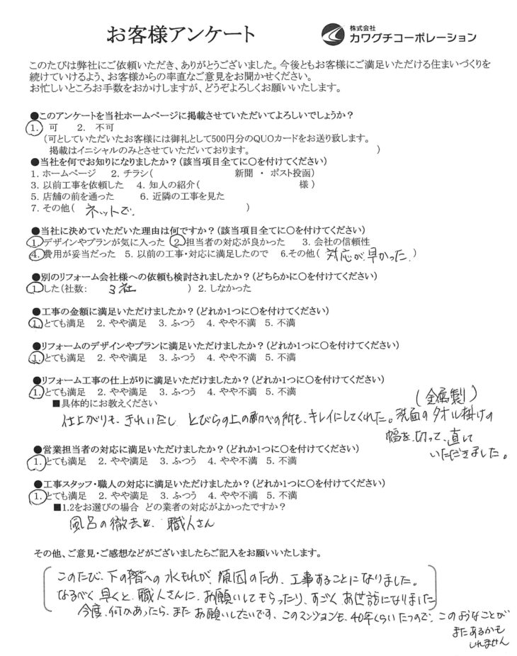 このたび下の階への水もれが原因のため、工事することになりました。なるべく早くと職人さんにお願いしてもらったり、すごくお世話になりました。