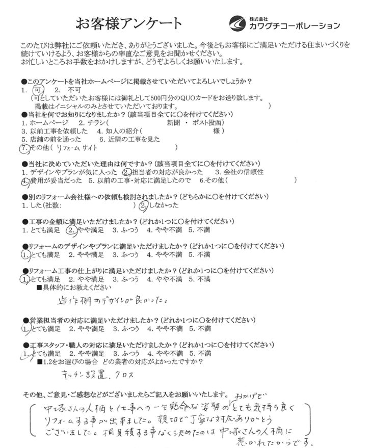 中塚さんの人柄と仕事への一生懸命な姿勢のおかげでとても気持ち良くリフォームする事が出来ました。親切で丁寧な対応ありがとうございました。相見積する事なく決めたのは中塚さんの人柄に惹かれたからです。