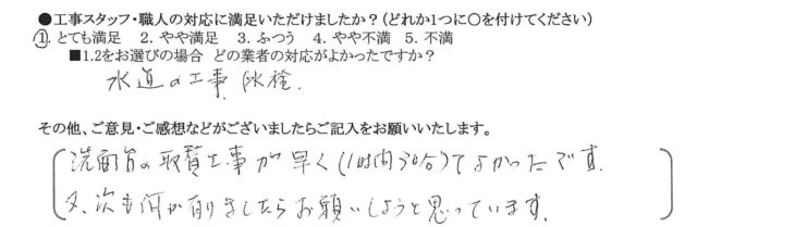 洗面台の取替工事が早く(1時間30分)てよかったです。