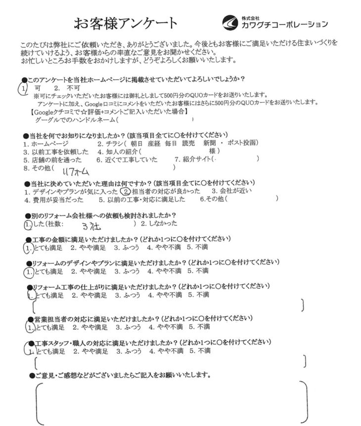 HOMEお客様の声大阪市 F様の声 大阪市 F様の声 当社に決めていただいた理由は何ですか? 担当者の対応が良かった。 リフォームのデザインやプランに満足いただけましたか? とても満足 リフォーム工事の仕上がりに満足いただけましたか? とても満足 営業担当者の対応に満足いただけましたか? とても満足 工事スタッフ・職人の対応に満足いただけましたか? とても満足 お客様の声一覧はこちら ライフテックについて 会社案内代表挨拶会社概要企業理念 はじめにお読みください 施工事例 施工事例一覧 戸建て マンション 全面改修 水まわり 洗面 キッチン 浴室 トイレ 内装 間取り変更 洋室改修 和室改修 その他 バルコニー・ベランダ 玄関 外壁・屋根 窓・サッシ お客様の声 お客様の声一覧 イベント情報 イベント情報一覧 カテゴリーなし お役立ち情報 お役立ちブログ 現場ブログ よくあるご質問 リフォームの流れ LINEで簡単見積もり ユニットバスキャンペーン 玄関ドアリフォーム 在来工法とカバー工法の違いをわかりやすく解説します 建具・家具工事 補修工事(リペア) 荷揚げ(揚重)工事 お問い合わせ お問い合わせ 無料お見積もり 資料請求 CONTACTお問い合わせ トップへ戻る 会社案内 会社案内代表挨拶会社概要企業理念 はじめにお読みください 施工事例 施工事例一覧 戸建て マンション 全面改修 水まわり 洗面 キッチン 浴室 トイレ 内装 間取り変更 洋室改修 和室改修 その他 バルコニー・ベランダ 玄関 外壁・屋根 窓・サッシ お客様の声 お客様の声一覧 お得なリフォーム情報 価格表 一覧お得なキッチンお得なトイレお得なお風呂お得な洗面化粧台 お役立ち情報 お役立ちブログ現場ブログよくあるご質問リフォームの流れLINEで簡単見積もりユニットバスキャンペーン玄関ドアリフォーム 在来工法とカバー工法の違いをわかりやすく解説します建具・家具工事補修工事(リペア)荷揚げ(揚重)工事 お問い合わせ お問い合わせ無料お見積もり資料請求 Copyright © 2018 ライフテック All Rights Reserved.