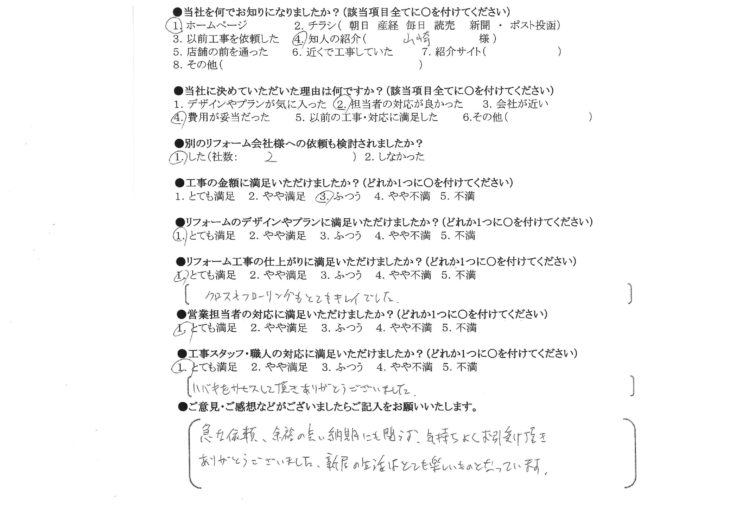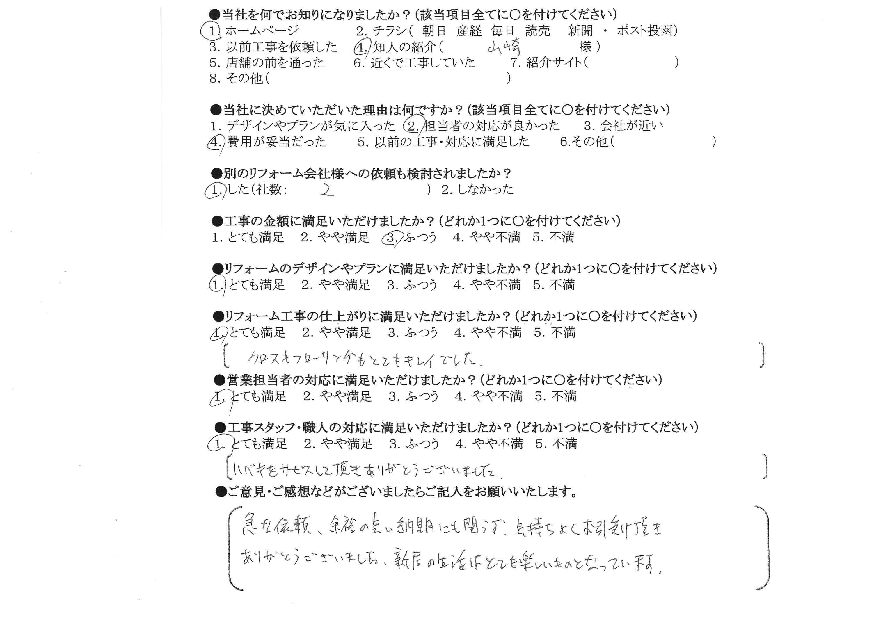 HOMEお客様の声寝屋川市 N様の声 マンション全面改修工事 寝屋川市 N様の声 マンション全面改修工事 当社に決めていただいた理由は何ですか? 担当者の対応が良かった。費用が妥当だった。 リフォームのデザインやプランに満足いただけましたか? とても満足 リフォーム工事の仕上がりに満足いただけましたか? とても満足 営業担当者の対応に満足いただけましたか? とても満足 工事スタッフ・職人の対応に満足いただけましたか? とても満足 お客様の声一覧はこちら ライフテックについて 会社案内代表挨拶会社概要企業理念 はじめにお読みください 施工事例 施工事例一覧 戸建て マンション 全面改修 水まわり 洗面 キッチン 浴室 トイレ 内装 間取り変更 洋室改修 和室改修 その他 バルコニー・ベランダ 玄関 外壁・屋根 窓・サッシ お客様の声 お客様の声一覧 イベント情報 イベント情報一覧 カテゴリーなし お役立ち情報 お役立ちブログ 現場ブログ よくあるご質問 リフォームの流れ LINEで簡単見積もり ユニットバスキャンペーン 玄関ドアリフォーム 在来工法とカバー工法の違いをわかりやすく解説します 建具・家具工事 補修工事(リペア) 荷揚げ(揚重)工事 お問い合わせ お問い合わせ 無料お見積もり 資料請求 CONTACTお問い合わせ トップへ戻る 会社案内 会社案内代表挨拶会社概要企業理念 はじめにお読みください 施工事例 施工事例一覧 戸建て マンション 全面改修 水まわり 洗面 キッチン 浴室 トイレ 内装 間取り変更 洋室改修 和室改修 その他 バルコニー・ベランダ 玄関 外壁・屋根 窓・サッシ お客様の声 お客様の声一覧 お得なリフォーム情報 価格表 一覧お得なキッチンお得なトイレお得なお風呂お得な洗面化粧台 お役立ち情報 お役立ちブログ現場ブログよくあるご質問リフォームの流れLINEで簡単見積もりユニットバスキャンペーン玄関ドアリフォーム 在来工法とカバー工法の違いをわかりやすく解説します建具・家具工事補修工事(リペア)荷揚げ(揚重)工事 お問い合わせ お問い合わせ無料お見積もり資料請求 Copyright © 2018 ライフテック All Rights Reserved.