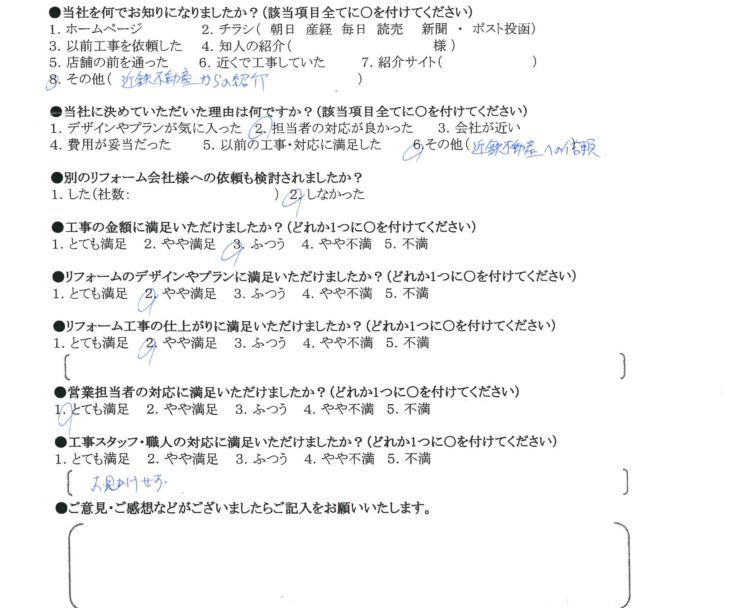 HOMEお客様の声豊中市 S様の声 内装工事・クリーニング 豊中市 S様の声 内装工事・クリーニング 当社に決めていただいた理由は何ですか? 担当者の対応が良かった。近鉄不動産への信頼。 リフォームのデザインやプランに満足いただけましたか? やや満足 リフォーム工事の仕上がりに満足いただけましたか? やや満足 営業担当者の対応に満足いただけましたか? とても満足 工事スタッフ・職人の対応に満足いただけましたか? お客様の声一覧はこちら ライフテックについて 会社案内代表挨拶会社概要企業理念 はじめにお読みください 施工事例 施工事例一覧 戸建て マンション 全面改修 水まわり 洗面 キッチン 浴室 トイレ 内装 間取り変更 洋室改修 和室改修 その他 バルコニー・ベランダ 玄関 外壁・屋根 窓・サッシ お客様の声 お客様の声一覧 イベント情報 イベント情報一覧 カテゴリーなし お役立ち情報 お役立ちブログ 現場ブログ よくあるご質問 リフォームの流れ LINEで簡単見積もり ユニットバスキャンペーン 玄関ドアリフォーム 在来工法とカバー工法の違いをわかりやすく解説します 建具・家具工事 補修工事(リペア) 荷揚げ(揚重)工事 お問い合わせ お問い合わせ 無料お見積もり 資料請求 CONTACTお問い合わせ トップへ戻る 会社案内 会社案内代表挨拶会社概要企業理念 はじめにお読みください 施工事例 施工事例一覧 戸建て マンション 全面改修 水まわり 洗面 キッチン 浴室 トイレ 内装 間取り変更 洋室改修 和室改修 その他 バルコニー・ベランダ 玄関 外壁・屋根 窓・サッシ お客様の声 お客様の声一覧 お得なリフォーム情報 価格表 一覧お得なキッチンお得なトイレお得なお風呂お得な洗面化粧台 お役立ち情報 お役立ちブログ現場ブログよくあるご質問リフォームの流れLINEで簡単見積もりユニットバスキャンペーン玄関ドアリフォーム 在来工法とカバー工法の違いをわかりやすく解説します建具・家具工事補修工事(リペア)荷揚げ(揚重)工事 お問い合わせ お問い合わせ無料お見積もり資料請求 Copyright © 2018 ライフテック All Rights Reserved.