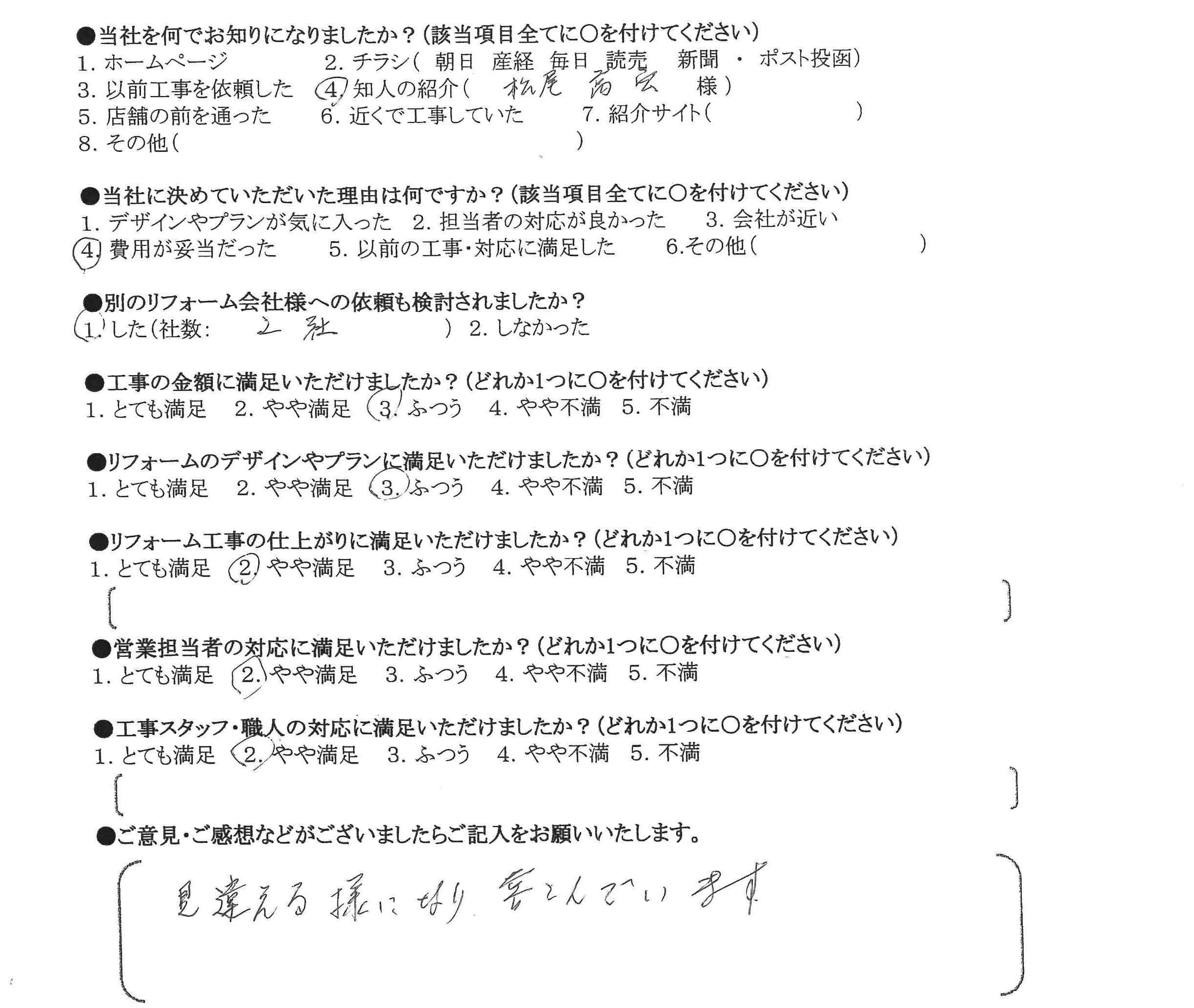 HOMEお客様の声大東市 O様の声 ポリカやり替え工事 大東市 O様の声 ポリカやり替え工事 当社に決めていただいた理由は何ですか? 費用が妥当だった。 リフォームのデザインやプランに満足いただけましたか? ふつう リフォーム工事の仕上がりに満足いただけましたか? とても満足 営業担当者の対応に満足いただけましたか? やや満足 工事スタッフ・職人の対応に満足いただけましたか? やや満足 お客様の声一覧はこちら ライフテックについて 会社案内代表挨拶会社概要企業理念 はじめにお読みください 施工事例 施工事例一覧 戸建て マンション 全面改修 水まわり 洗面 キッチン 浴室 トイレ 内装 間取り変更 洋室改修 和室改修 その他 バルコニー・ベランダ 玄関 外壁・屋根 窓・サッシ お客様の声 お客様の声一覧 イベント情報 イベント情報一覧 カテゴリーなし お役立ち情報 お役立ちブログ 現場ブログ よくあるご質問 リフォームの流れ LINEで簡単見積もり ユニットバスキャンペーン 玄関ドアリフォーム 在来工法とカバー工法の違いをわかりやすく解説します 建具・家具工事 補修工事(リペア) 荷揚げ(揚重)工事 お問い合わせ お問い合わせ 無料お見積もり 資料請求 CONTACTお問い合わせ トップへ戻る 会社案内 会社案内代表挨拶会社概要企業理念 はじめにお読みください 施工事例 施工事例一覧 戸建て マンション 全面改修 水まわり 洗面 キッチン 浴室 トイレ 内装 間取り変更 洋室改修 和室改修 その他 バルコニー・ベランダ 玄関 外壁・屋根 窓・サッシ お客様の声 お客様の声一覧 お得なリフォーム情報 価格表 一覧お得なキッチンお得なトイレお得なお風呂お得な洗面化粧台 お役立ち情報 お役立ちブログ現場ブログよくあるご質問リフォームの流れLINEで簡単見積もりユニットバスキャンペーン玄関ドアリフォーム 在来工法とカバー工法の違いをわかりやすく解説します建具・家具工事補修工事(リペア)荷揚げ(揚重)工事 お問い合わせ お問い合わせ無料お見積もり資料請求 Copyright © 2018 ライフテック All Rights Reserved.