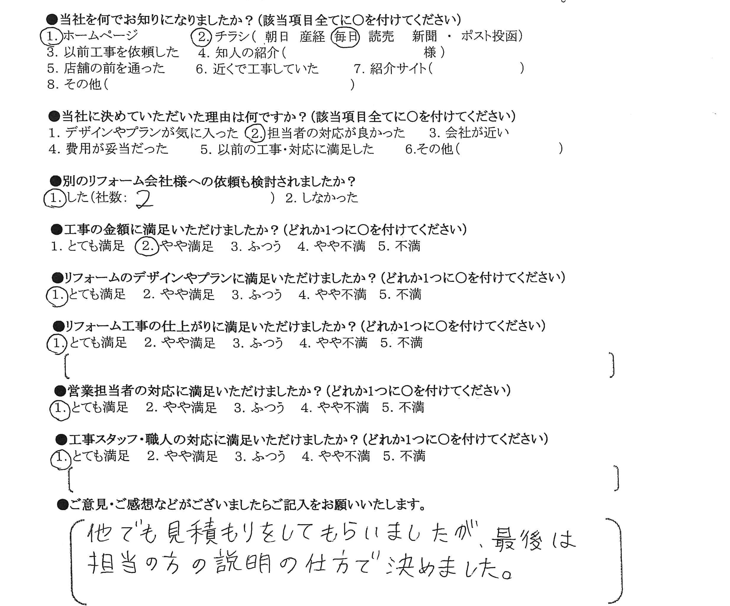 HOMEお客様の声門真市 T様の声 洗面・トイレ・キッチン水栓交換工事 門真市 T様の声 洗面・トイレ・キッチン水栓交換工事 当社に決めていただいた理由は何ですか? 担当者の対応が良かった。 リフォームのデザインやプランに満足いただけましたか? とても満足 リフォーム工事の仕上がりに満足いただけましたか? とても満足 営業担当者の対応に満足いただけましたか? とても満足 工事スタッフ・職人の対応に満足いただけましたか? とても満足 お客様の声一覧はこちら ライフテックについて 会社案内代表挨拶会社概要企業理念 はじめにお読みください 施工事例 施工事例一覧 戸建て マンション 全面改修 水まわり 洗面 キッチン 浴室 トイレ 内装 間取り変更 洋室改修 和室改修 その他 バルコニー・ベランダ 玄関 外壁・屋根 窓・サッシ お客様の声 お客様の声一覧 イベント情報 イベント情報一覧 カテゴリーなし お役立ち情報 お役立ちブログ 現場ブログ よくあるご質問 リフォームの流れ LINEで簡単見積もり ユニットバスキャンペーン 玄関ドアリフォーム 在来工法とカバー工法の違いをわかりやすく解説します 建具・家具工事 補修工事(リペア) 荷揚げ(揚重)工事 お問い合わせ お問い合わせ 無料お見積もり 資料請求 CONTACTお問い合わせ トップへ戻る 会社案内 会社案内代表挨拶会社概要企業理念 はじめにお読みください 施工事例 施工事例一覧 戸建て マンション 全面改修 水まわり 洗面 キッチン 浴室 トイレ 内装 間取り変更 洋室改修 和室改修 その他 バルコニー・ベランダ 玄関 外壁・屋根 窓・サッシ お客様の声 お客様の声一覧 お得なリフォーム情報 価格表 一覧お得なキッチンお得なトイレお得なお風呂お得な洗面化粧台 お役立ち情報 お役立ちブログ現場ブログよくあるご質問リフォームの流れLINEで簡単見積もりユニットバスキャンペーン玄関ドアリフォーム 在来工法とカバー工法の違いをわかりやすく解説します建具・家具工事補修工事(リペア)荷揚げ(揚重)工事 お問い合わせ お問い合わせ無料お見積もり資料請求 Copyright © 2018 ライフテック All Rights Reserved.