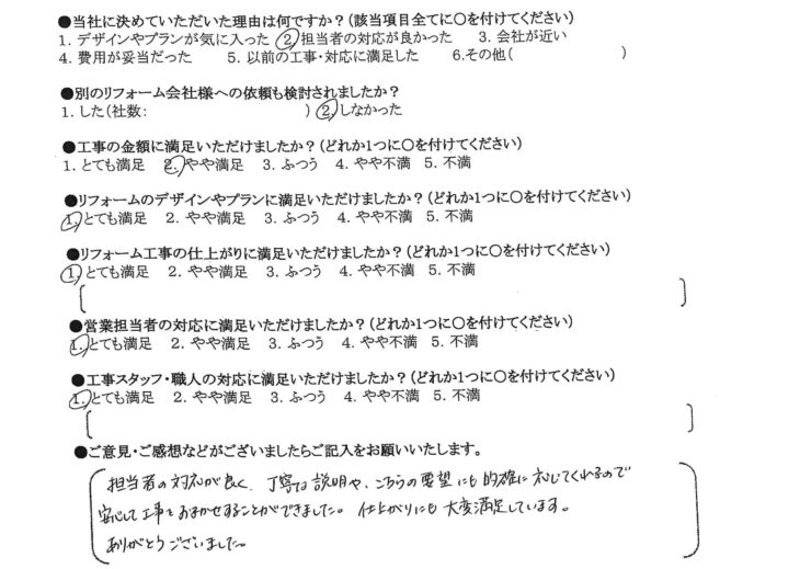 HOMEお客様の声門真市 N様の声 ユニットバス・トイレ交換工事 門真市 N様の声 ユニットバス・トイレ交換工事 当社に決めていただいた理由は何ですか? 担当者の対応が良かった リフォームのデザインやプランに満足いただけましたか? とても満足 リフォーム工事の仕上がりに満足いただけましたか? とても満足 営業担当者の対応に満足いただけましたか? とても満足 工事スタッフ・職人の対応に満足いただけましたか? とても満足 お客様の声一覧はこちら ライフテックについて 会社案内代表挨拶会社概要企業理念 はじめにお読みください 施工事例 施工事例一覧 戸建て マンション 全面改修 水まわり 洗面 キッチン 浴室 トイレ 内装 間取り変更 洋室改修 和室改修 その他 バルコニー・ベランダ 玄関 外壁・屋根 窓・サッシ お客様の声 お客様の声一覧 イベント情報 イベント情報一覧 カテゴリーなし お役立ち情報 お役立ちブログ 現場ブログ よくあるご質問 リフォームの流れ LINEで簡単見積もり ユニットバスキャンペーン 玄関ドアリフォーム 在来工法とカバー工法の違いをわかりやすく解説します 建具・家具工事 補修工事(リペア) 荷揚げ(揚重)工事 お問い合わせ お問い合わせ 無料お見積もり 資料請求 CONTACTお問い合わせ トップへ戻る 会社案内 会社案内代表挨拶会社概要企業理念 はじめにお読みください 施工事例 施工事例一覧 戸建て マンション 全面改修 水まわり 洗面 キッチン 浴室 トイレ 内装 間取り変更 洋室改修 和室改修 その他 バルコニー・ベランダ 玄関 外壁・屋根 窓・サッシ お客様の声 お客様の声一覧 お得なリフォーム情報 価格表 一覧お得なキッチンお得なトイレお得なお風呂お得な洗面化粧台 お役立ち情報 お役立ちブログ現場ブログよくあるご質問リフォームの流れLINEで簡単見積もりユニットバスキャンペーン玄関ドアリフォーム 在来工法とカバー工法の違いをわかりやすく解説します建具・家具工事補修工事(リペア)荷揚げ(揚重)工事 お問い合わせ お問い合わせ無料お見積もり資料請求 Copyright © 2018 ライフテック All Rights Reserved.
