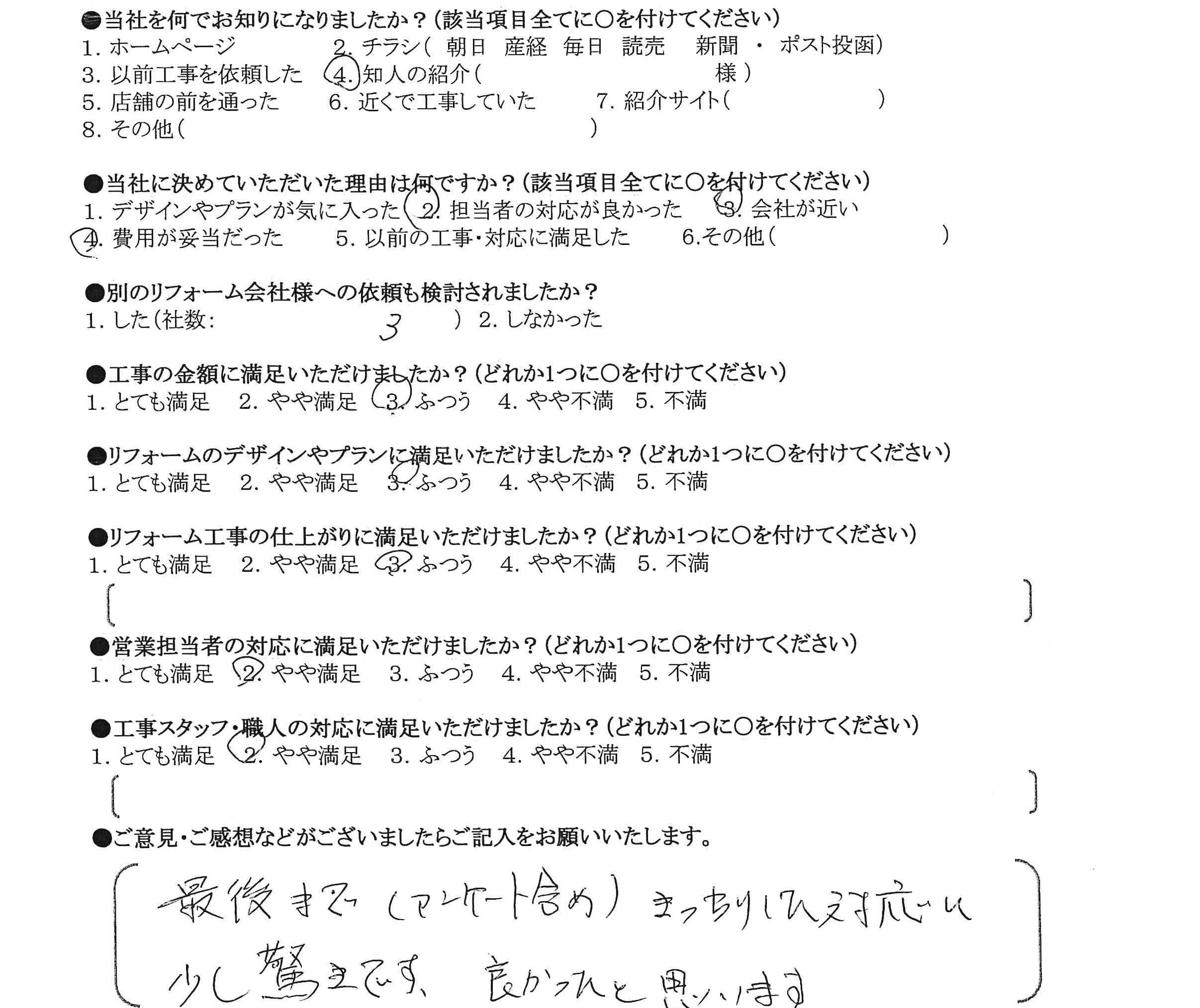 HOMEお客様の声守口市 I様の声 レンジフード交換 守口市 I様の声 レンジフード交換 当社に決めていただいた理由は何ですか? 担当者の対応が良かった。会社が近い。費用が妥当だった。 リフォームのデザインやプランに満足いただけましたか? ふつう リフォーム工事の仕上がりに満足いただけましたか? ふつう 営業担当者の対応に満足いただけましたか? やや満足 工事スタッフ・職人の対応に満足いただけましたか? やや満足 お客様の声一覧はこちら ライフテックについて 会社案内代表挨拶会社概要企業理念 はじめにお読みください 施工事例 施工事例一覧 戸建て マンション 全面改修 水まわり 洗面 キッチン 浴室 トイレ 内装 間取り変更 洋室改修 和室改修 その他 バルコニー・ベランダ 玄関 外壁・屋根 窓・サッシ お客様の声 お客様の声一覧 イベント情報 イベント情報一覧 カテゴリーなし お役立ち情報 お役立ちブログ 現場ブログ よくあるご質問 リフォームの流れ LINEで簡単見積もり ユニットバスキャンペーン 玄関ドアリフォーム 在来工法とカバー工法の違いをわかりやすく解説します 建具・家具工事 補修工事(リペア) 荷揚げ(揚重)工事 お問い合わせ お問い合わせ 無料お見積もり 資料請求 CONTACTお問い合わせ トップへ戻る 会社案内 会社案内代表挨拶会社概要企業理念 はじめにお読みください 施工事例 施工事例一覧 戸建て マンション 全面改修 水まわり 洗面 キッチン 浴室 トイレ 内装 間取り変更 洋室改修 和室改修 その他 バルコニー・ベランダ 玄関 外壁・屋根 窓・サッシ お客様の声 お客様の声一覧 お得なリフォーム情報 価格表 一覧お得なキッチンお得なトイレお得なお風呂お得な洗面化粧台 お役立ち情報 お役立ちブログ現場ブログよくあるご質問リフォームの流れLINEで簡単見積もりユニットバスキャンペーン玄関ドアリフォーム 在来工法とカバー工法の違いをわかりやすく解説します建具・家具工事補修工事(リペア)荷揚げ(揚重)工事 お問い合わせ お問い合わせ無料お見積もり資料請求 Copyright © 2018 ライフテック All Rights Reserved.