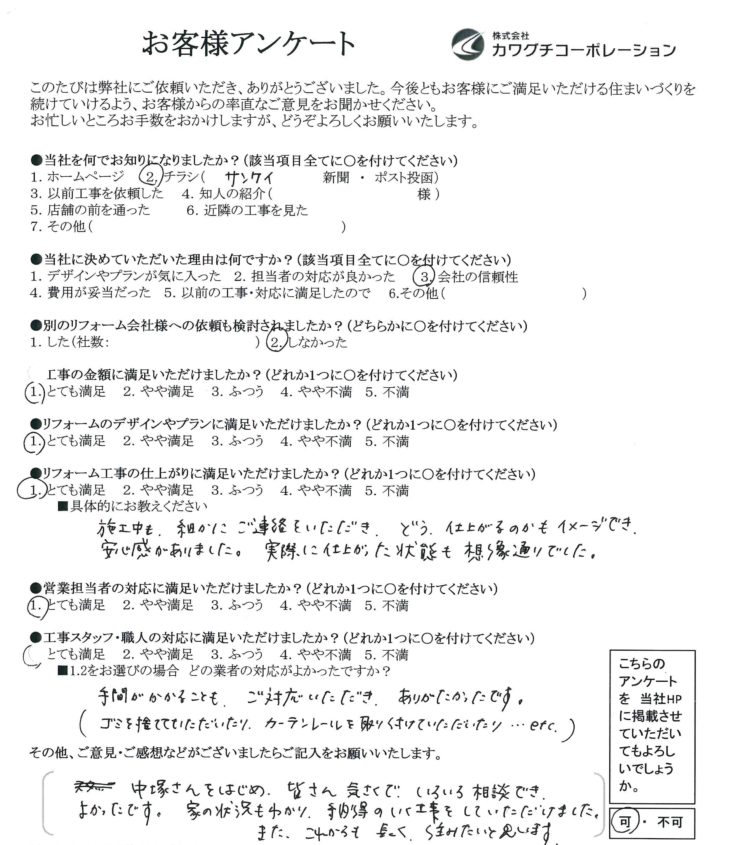 中塚さんをはじめ、皆さん気さくでいろいろ相談できよかったです。家の状況もわかり、納得のいく工事をしていただけました。