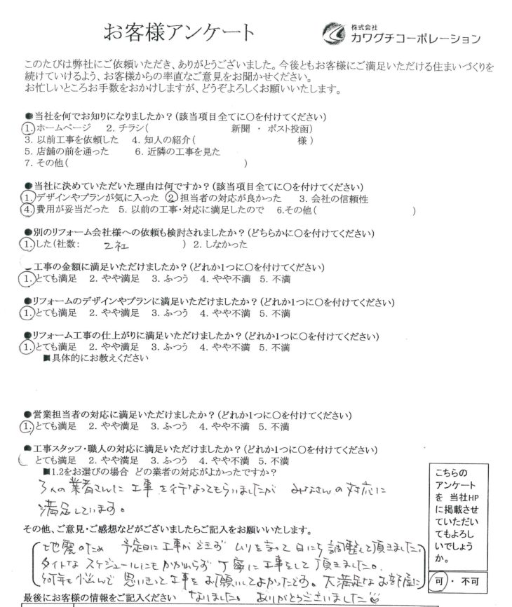 地震のため、予定日に工事ができずムリを言って日にち調整して頂きました。タイトなスケジュールにもかかわらず丁寧に工事をして頂きました。
