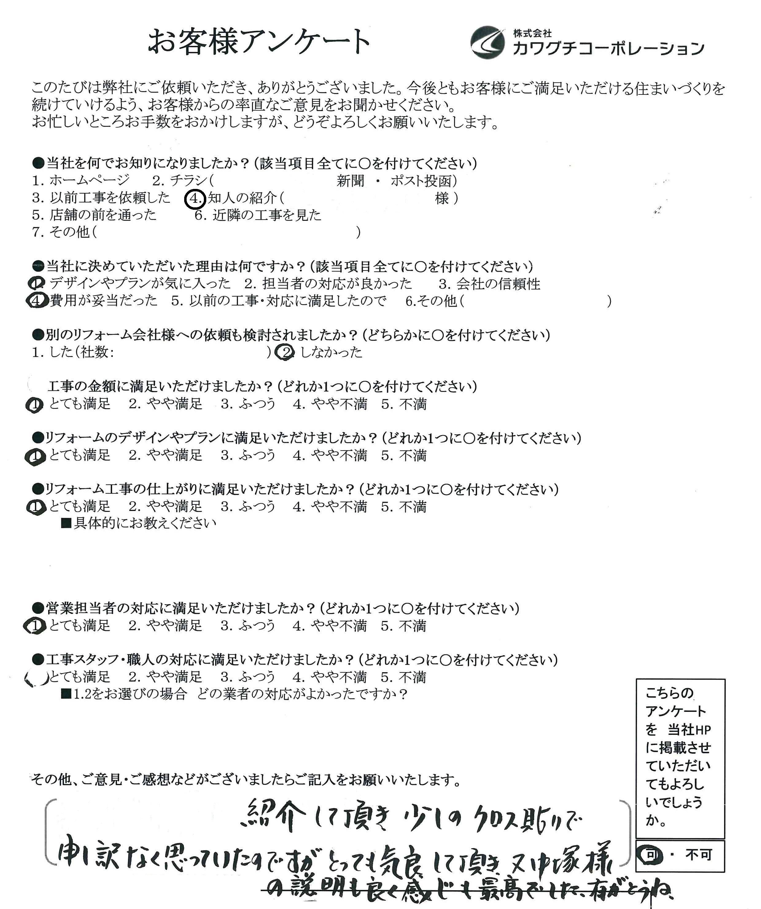 紹介して頂き、少しのクロス貼で申し訳なく思っていたのですがとっても気良して頂き、又中塚様の説明も良く感じも最高でした。