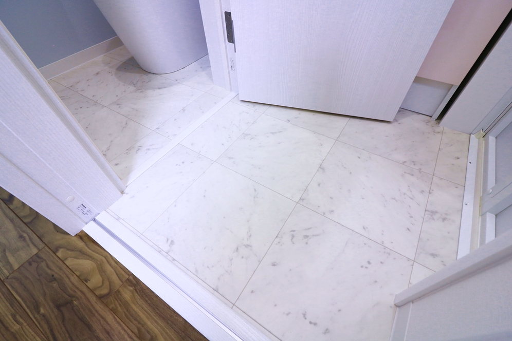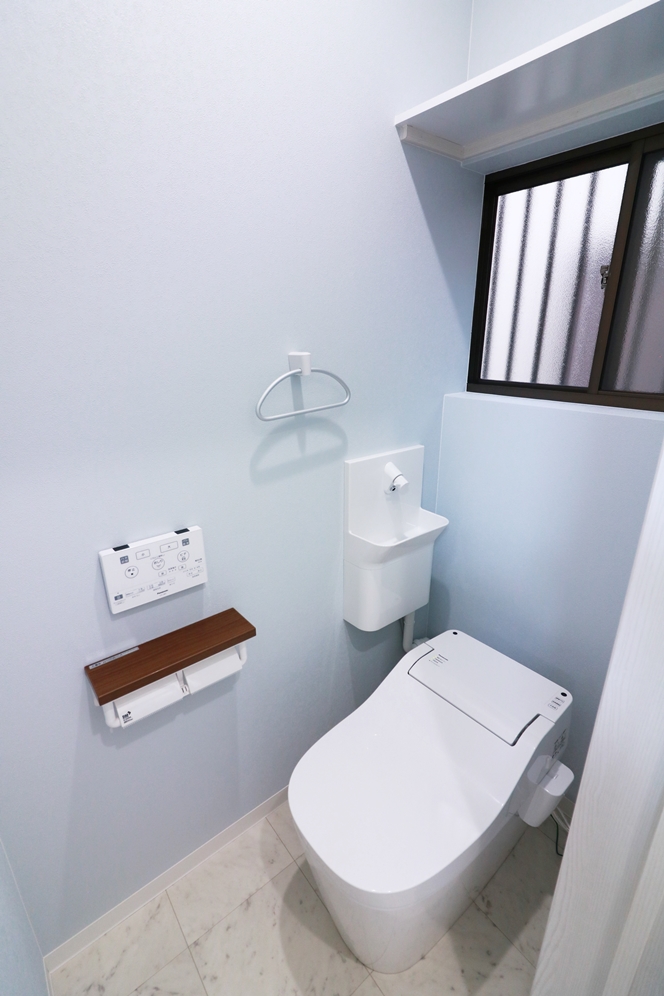 便器:Panasonic タンクレストイレ アラウーノSⅡ コーナー手洗付 棚付2連紙巻器:LIXIL CF-AA64KU タオル掛け:LIXIL KF-AA70C クロス、クッションフロア 建具:Panasonic ベリティス |