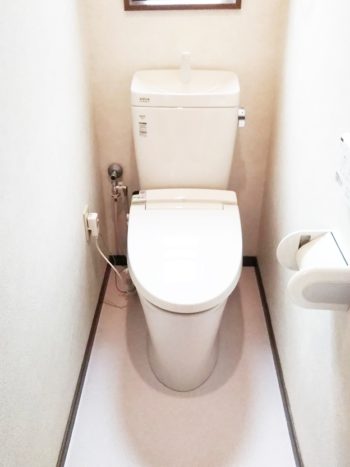 当初、内装はせずにトイレ交換だけでお考えでしたが、 既存の床がフローリングでしたので、 長年お使いになるうちに汚れや水のハネが床のシミになってしまうことをお話しました。 水まわりですので、拭き掃除のしやすいクッションフロアをお勧めし、 トイレ交換とクロスを含めた内装貼替をしました。 内装をやり替え、トイレのお色がホワイトなので、 とても清潔感のある明るい空間になりました。 また、シャワートイレをリモコン式にしましたので、 奥までそうじがしやすいようになりました。 |
