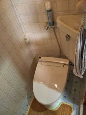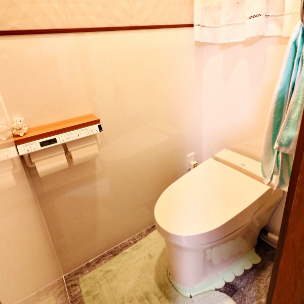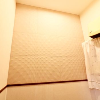 壁と床のタイルを取り、大工工事で真壁(柱など木が見えている和室のような仕様)のお部屋を大壁(柱など木が見えない仕様)にしました。 もちろん、入口段差も床を上げて解消しています。 トイレ室の空間がコンパクトなため、タンク付トイレを設置すると人が立つと窮屈な寸法になってしまう状況でした。 そこで、前出寸法がコンパクトな【タンクレストイレ LIXILサティス】をご提案し、部屋の角に小さな手洗器も据えるようにしました。 手入れがしやすいよう、壁には手洗器の高さまでパネルを貼り、床には【東リ 消臭トワレ】を貼っています。 また、トイレ室のアクセントにもなり、ニオイも吸ってくれる【エコカラット】を壁の1面に貼りました。トイレ室に入るたびに、キレイになってうれしい気分になる空間になりました。 |