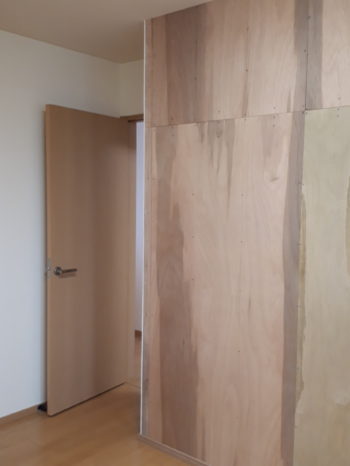 元々間仕切りができるように設計されていましたので、コンセントやスイッチなどの問題もなく施工できました。 少しでも工事を楽しんでいただこうと、サンプルを取り寄せご家族でアクセントになるクロスをお選びいただきました。 新しい壁に棚などを固定されることがあるかもしれませんので、下地はボードではなくベニヤ板にしました。 |