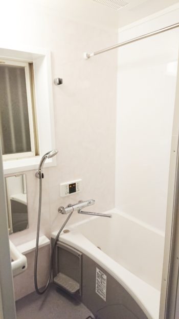 お風呂のサイズがどれほど変わるか、器具をつける面に大きな窓があるため、 シャワーフックやミラーの位置・大きさが決まってしまうことなど、 事前にたくさんお話させていただきました。 浴室サイズがコンパクトで断熱浴槽が選択できないため、 浴室暖房機を新設し、暖かいお風呂になりました。 |