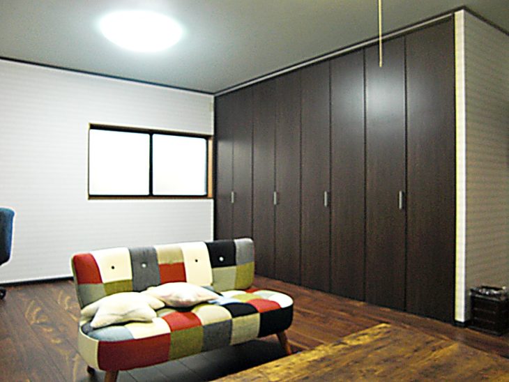 2つある洋室の使い勝手にお悩みだったため、間仕切り壁をなくし、 その際に役割のなくなる廊下も含めてひとつの大きなお部屋をつくることをご提案いたしました。 ご愛用の家具にあわせてアクセントのきいた、キャラクタープリントのクロスもお選びいただき、 広くなったお部屋でこれからはのびのびとお過ごしいただけるようになりました。 各部屋にあったクローゼットは、小さくて収納力があまりありませんでしたので、一番大きなクローゼットを設けました。 内部は仕切りを多く作らず、お客様が自由に大小さまざまなものを収納できるようにしてあります。 |