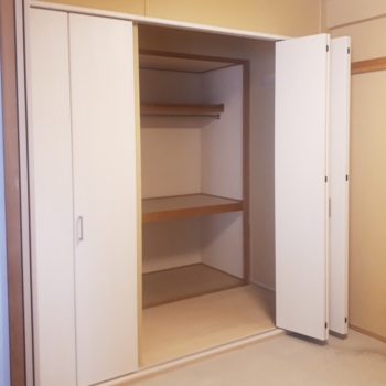 お手持ちの収納BOXの大きさから、間仕切り壁を立てる位置や中段の高さをどうするかなど たくさんお打合せさせていただきました。 当初は引き戸をご希望されていましたが、折れ戸であれば枠の奥行きも少なく 引き戸のように建具が端から端まで自由に動かせることをご説明し、折れ戸で施工することとなりました。 |