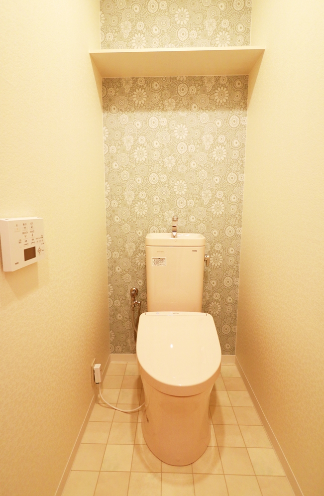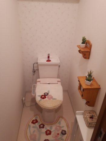 当初よりTOTOのトイレに交換したい とのご要望をお伺いしておりましたので ご希望の内容をお伺いし、設置しました。 トイレ室のドアを開けて正面となる壁に お好みのアクセントクロスをお選びいただきました。 とても明るくかわいいトイレ室に生まれ変わりました。 |