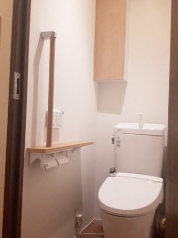 パイプ(配管)スペースがありましたので キャビネットをどのように取付するかお打合せを重ね 取付をした際に柱型とのバランスが取れるよう縦長でスマートに見えるものをお選びいただきました。 トイレは、手入れがしやすく節水タイプのものを設置しました。 紙巻器と手すりが一体となった棚手すりを取付しましたので 今後も安心してお使いいただけるトイレとなりました。 |