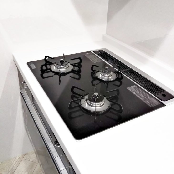 キッチン:Panasonic ラクシーナ 水栓:タカギ 浄水器一体型水栓 ガスコンロ:Paloma BRilliOα 照明:KOIZUMI ダウンライト |