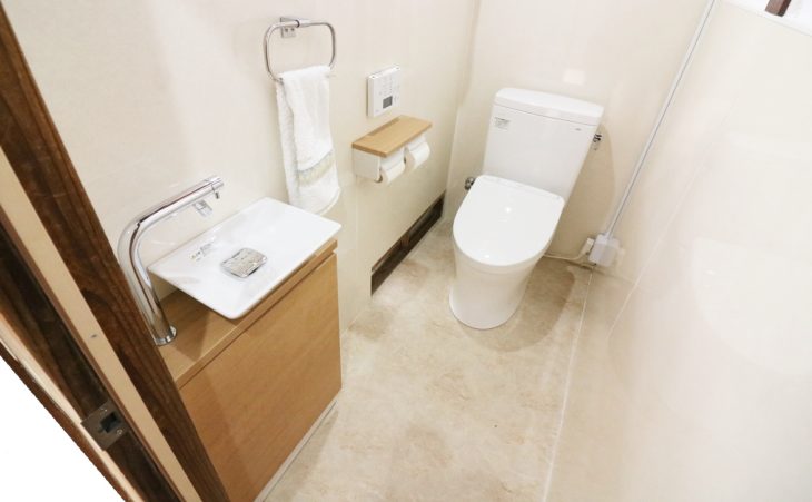 | お客様のご要望 | 便器が割れたのをきっかけにリフォームをしようと思った。膝への負担も考え、和式から洋式トイレに変えたい。 手洗い器の大きい、掃除のしやすいトイレ室にしたい。 |