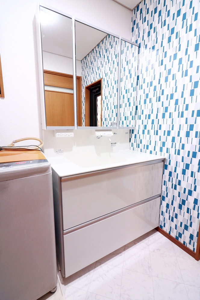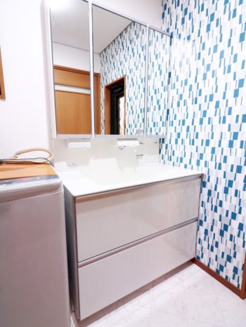洗面化粧台:Panasonic ウツクシーズ 洗濯機パン:LIXIL 洗濯機水栓:LIXIL |