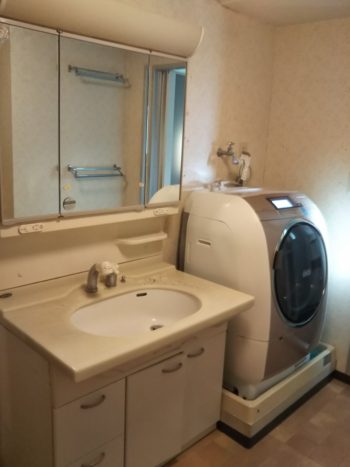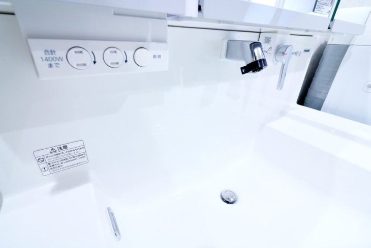 今お使いの洗面化粧台でのお悩みを聞くことから始めました。一番のお悩みはこすっても取れない汚れですが、他にお伺いすると、洗面台・洗面室内の照明が暗いこともお悩みでした。 洗面化粧台の前でお化粧をされるとのことでしたので、ミラーキャビネット正面に照明を縦に配置した【Panasonic 美ルック ミラクルミラー】にしました。 とても明るく、また見た目もスッキリしました。洗面室全体の照明は、お部屋がとても広いのでダウンライト4台を配置し、部屋全体がまんべんなく明るくなるようにしました。 |